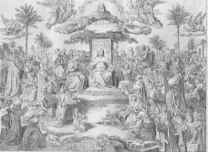 4. Und ich sah Stühle, und sie setzten sich darauf, und es wurde ihnen gegeben, Gericht zu halten, und (sah) die Seelen derjenigen, die wegen des Zeugnisses Jesu und wegen des Wortes Gottes enthauptet worden sind, die weder das Tier, noch dessen Bild angebetet, noch dessen Malzeichen an ihrer Stirne oder an ihrer Hand empfangen haben: und sie lebten und regierten mit Christo tausend Jahre. (3)